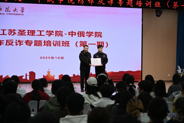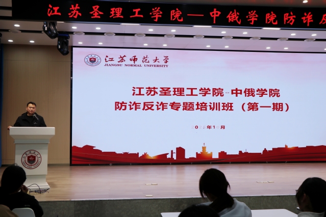 为筑牢校园安全屏障,提升青年学子防诈识诈能力,10月22日晚,江苏圣理工学院-中俄学院在泉山校区路演大厅举办“青春护航・无诈校园”防诈反诈专题培训班(第一期)暨法治辅导员及防诈反诈宣传员聘任仪式。此次培训特邀上海铁路公安局徐州公安处徐州南站派出所副所长、一级警长祁中誉主讲,学院相关领导、教职工及学生干部共计260余人参加,学院党委副书记孙志强主持。活动通过“聘任+宣讲+演绎+赋能”四维模式,构建沉浸式反诈教育场景。