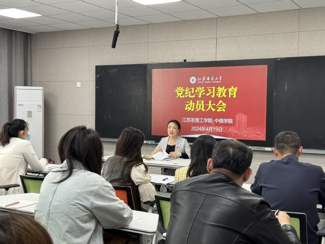 4月19日下午,江苏圣理工学院-中俄学院在学院402教室召开党纪学习教育动员大会。会议由学院党委书记尹燕萍主持,全体师生党员参加。