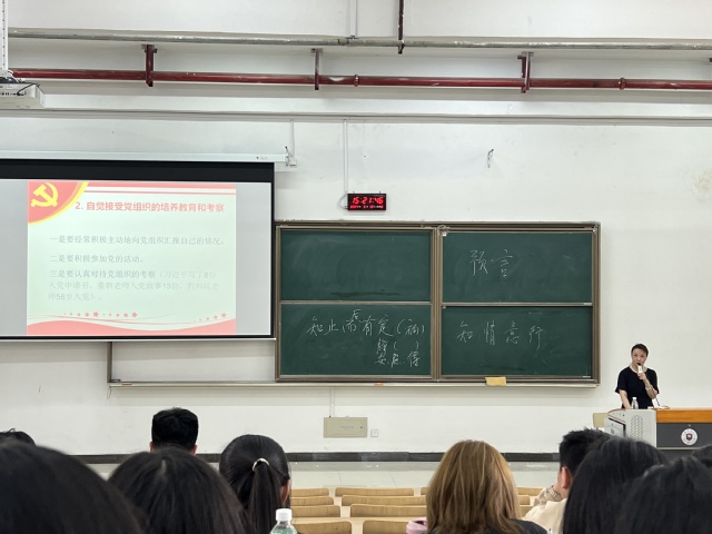 尹燕萍作题为“端正入党动机,争取早日入党”的专题党课。讲座伊始,尹书记以“为什么要入党”这一启发式的问题入手,邀请学员们分享入党动机,结合学员们的发言引出党课主题。接着从“是什么、为什么、怎么办、怎么样”四个层面,通过案例解析、讨论交流、观看视频等方式,让学员们了解端正入党动机是思想上入党的强大动力,组织上入党一生一次,思想上入党一生一世,教育引导学员坚定理想信念,加强自我修养,积极为同学服务,用实际行动践行诺言,为党旗增光添彩。